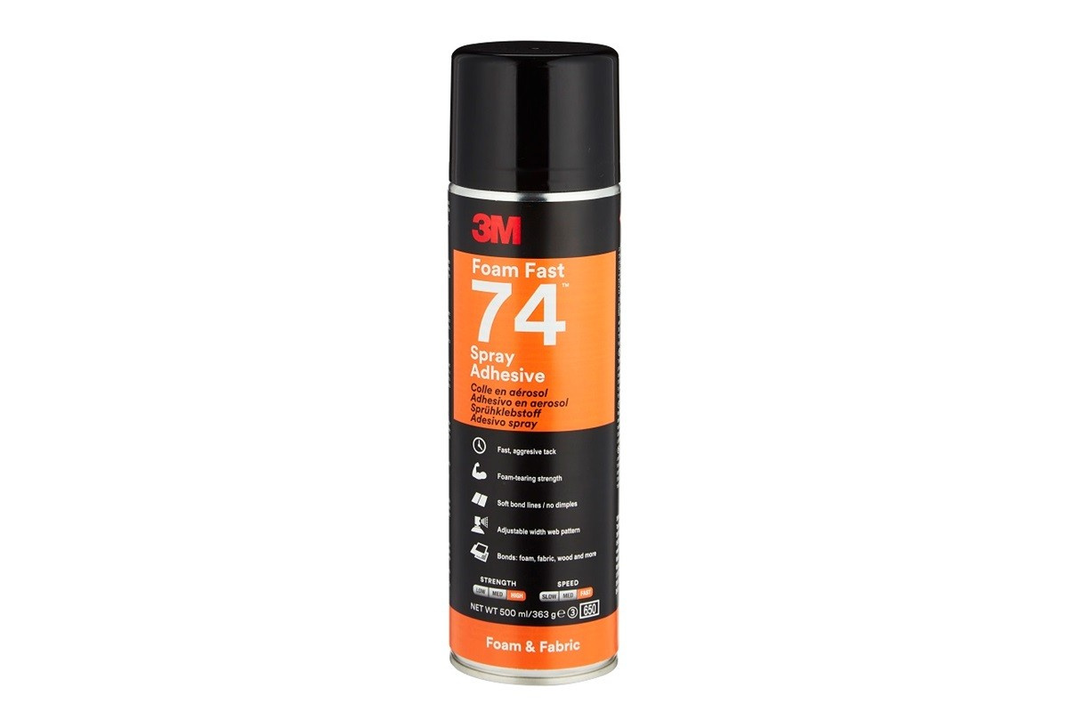 Висококачественото бързо прилепващо спрей лепило 3M Scotch-Weld 74 залепва гъвкави полиуретанови или латексови пени една към друга, както и към други материали (дърво, метал, пластмаса и др.).