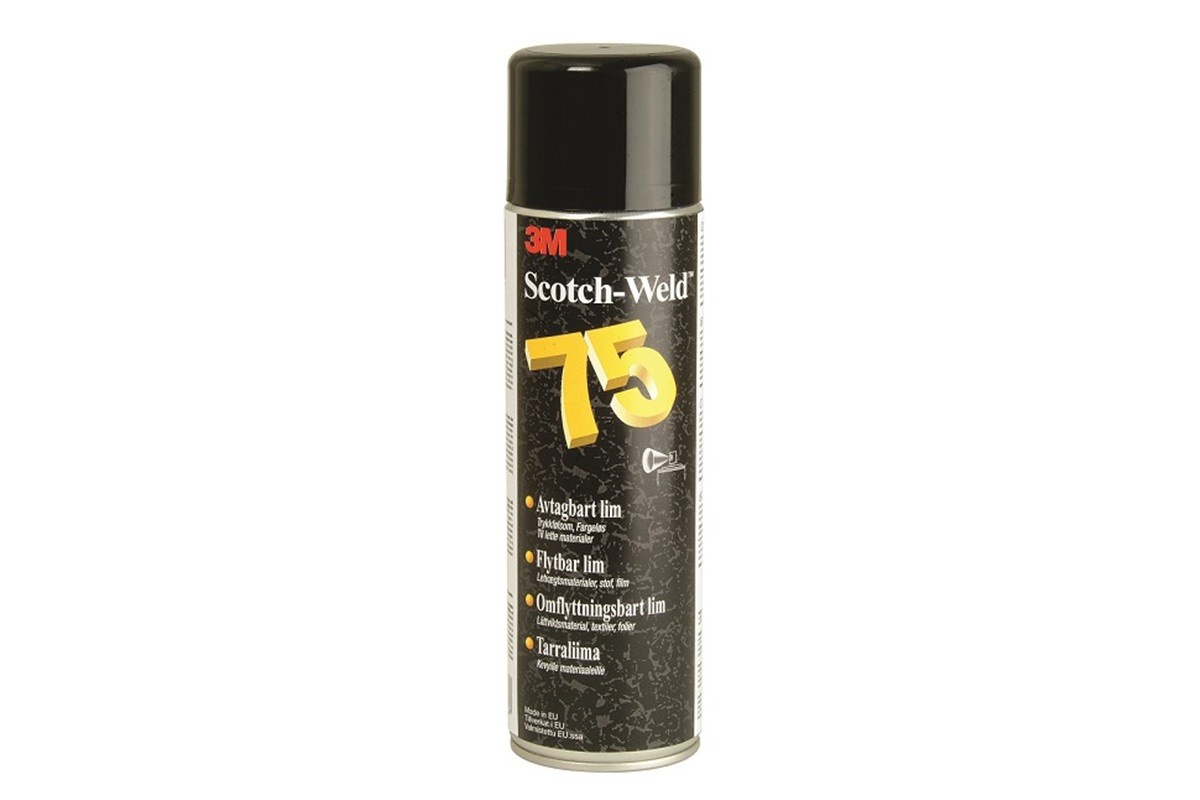 Активираното от натиск безцветно спрей лепило 3M Scotch-Weld 75 е идеално за временно фиксиране на леки материали, които могат да бъдат многократно отлепвани и премествани.