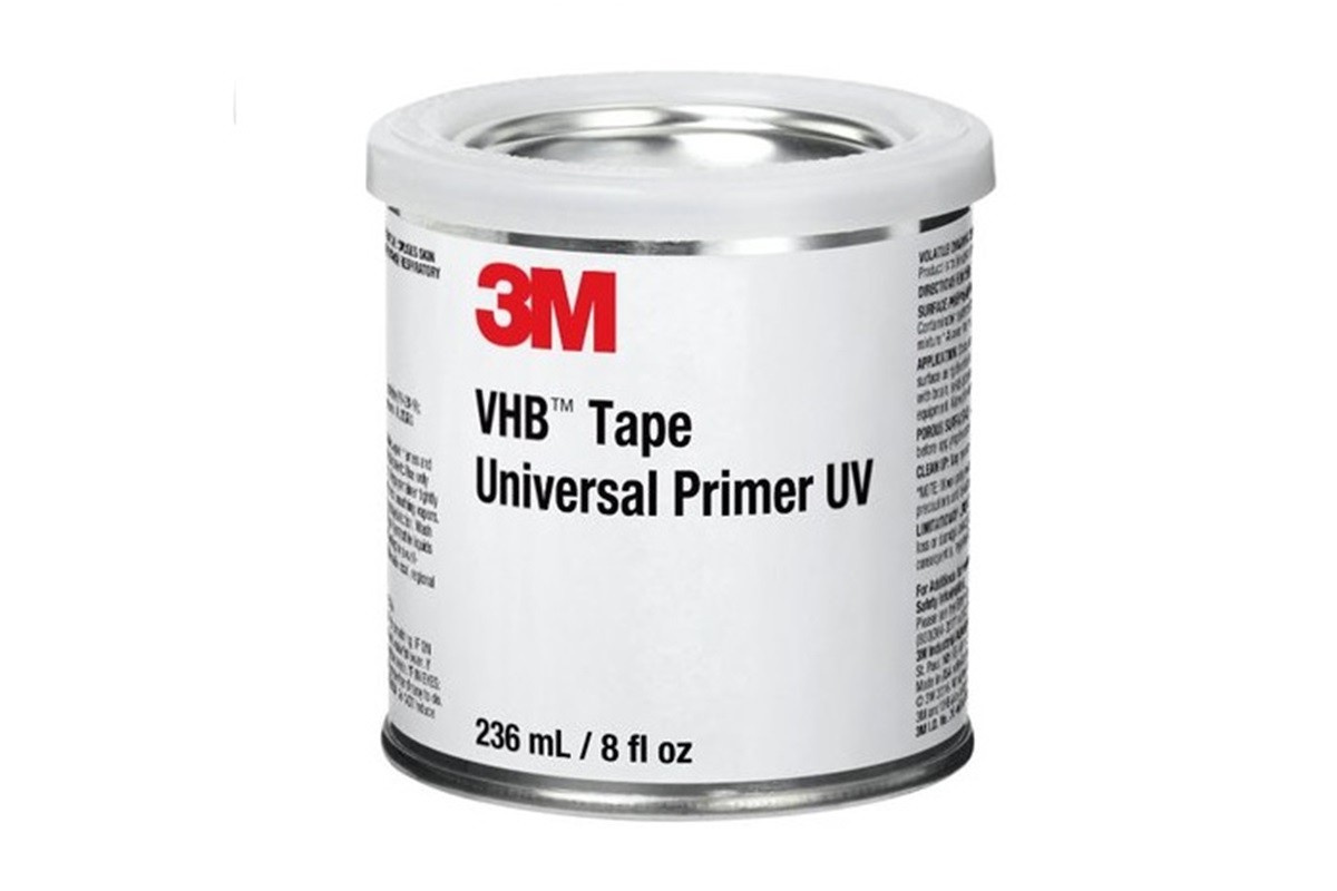 3M VHB Tape Universal Primer UV е предназначен за подобряване на адхезията на 3M VHB ленти върху широка гама от повърхности, като полипропилен, ABS, акрил, поликарбонат, найлон, FRP (пластмаса, подсилена с влакна), немекотено PVC, стъкло, метал и боядисани повърхности. Грундът съдържа UV флуоресцентен пигмент, който помага за контролиране на оптималния слой грунд. Изсъхва бързо. Иновираната формула на праймера с намалена миризма е щадяща към природата и здравето. Технически параметри система:разтворителна устойчивост на UV:отлична устойчивост на влага:отлична устойчивост на химически вещества:много добра приложение:с четка, гъба