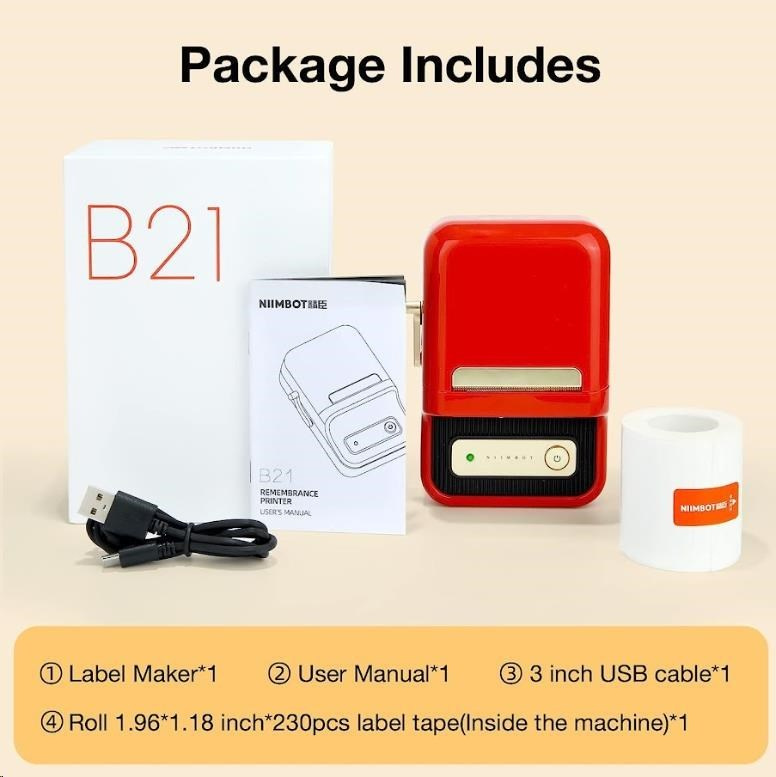 Принтер за етикети Niimbot Smart B21 1AC13081606, USB-C кабел за зареждане, комплект бели самозалепващи се етикети 50 x 30 мм (210 бр.), ръководство за потребителя