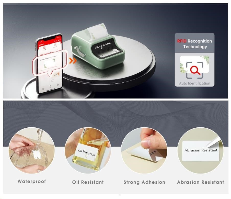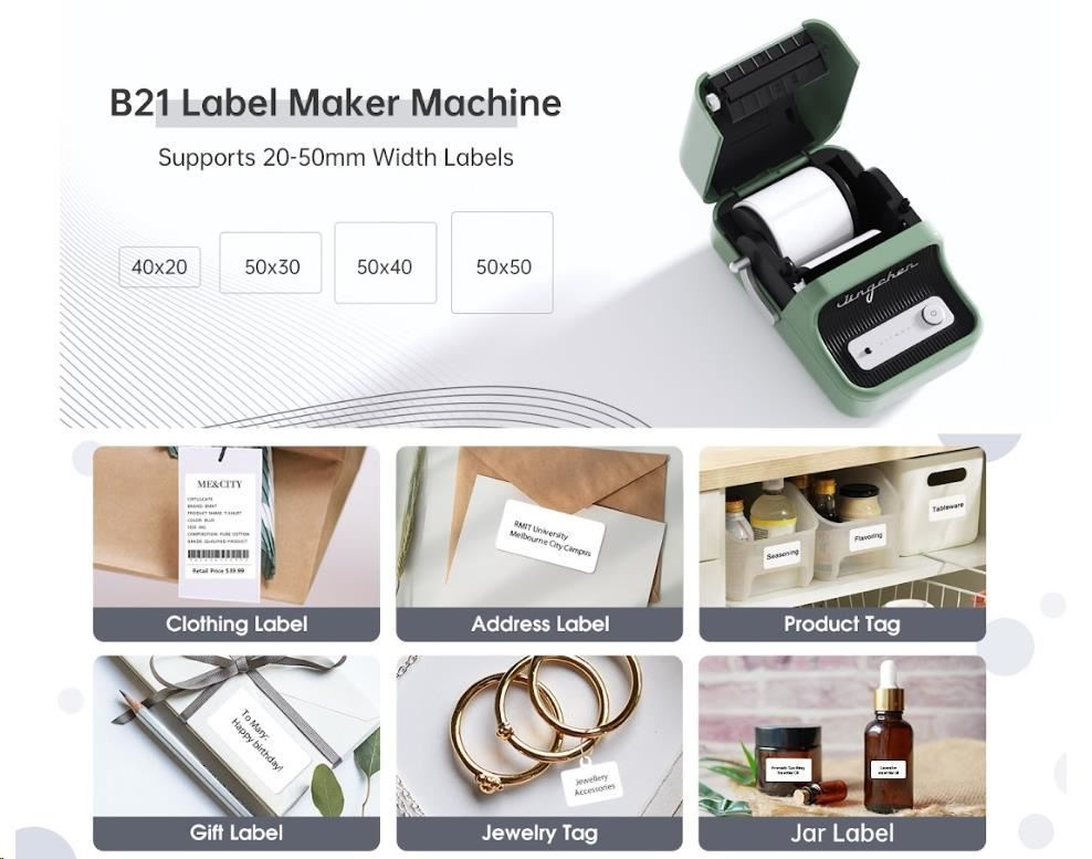 Niimbot B21 Smart 1AC19031602 е проектиран за дългосрочна надеждност. Висококачествената японска печатаща глава гарантира висока издръжливост, прецизност и дълготрайност на печата. Етикетите Niimbot са ламинирани, устойчиви на вода, масло, UV лъчи и замръзване, което ги прави четливи и здраво прилепнали дори в трудни условия.