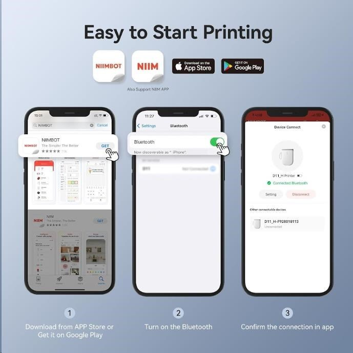 Съвместим е с приложението Niimbot App, достъпно за Android и iOS, така че можете удобно да проектирате и отпечатвате етикети директно от своя смартфон или таблет.Този модел предлага резолюция 300 dpi, ширина на печат до 12 мм и поддържа ленти с ширина 12–15 мм, което гарантира ясен, четлив и професионален изход. Новият Bluetooth модул позволява свързване на до шест устройства едновременно, идеален за споделена работна среда.