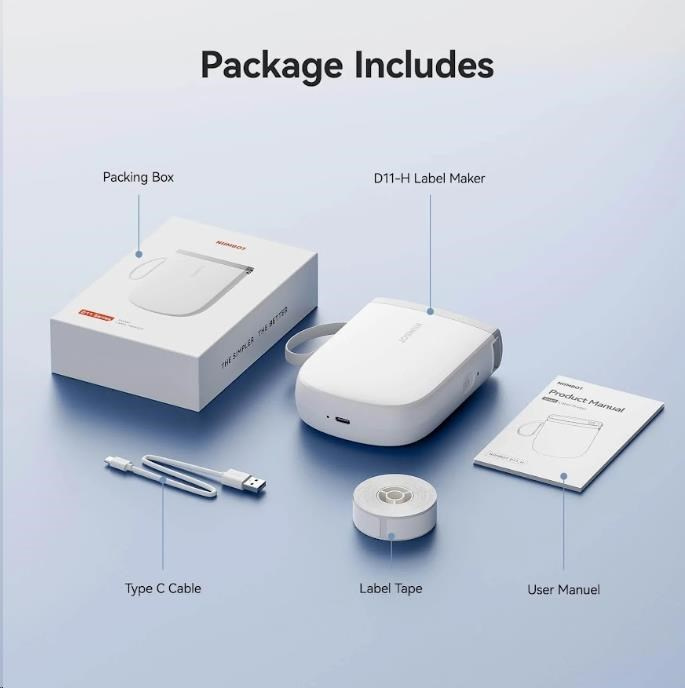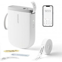 Етикетиращо устройство Niimbot D11-H Smart 1AA57281601, каишка за китка, USB-C кабел за зареждане, комплект бели самозалепващи се етикети 12 x 40 мм (160 бр.)