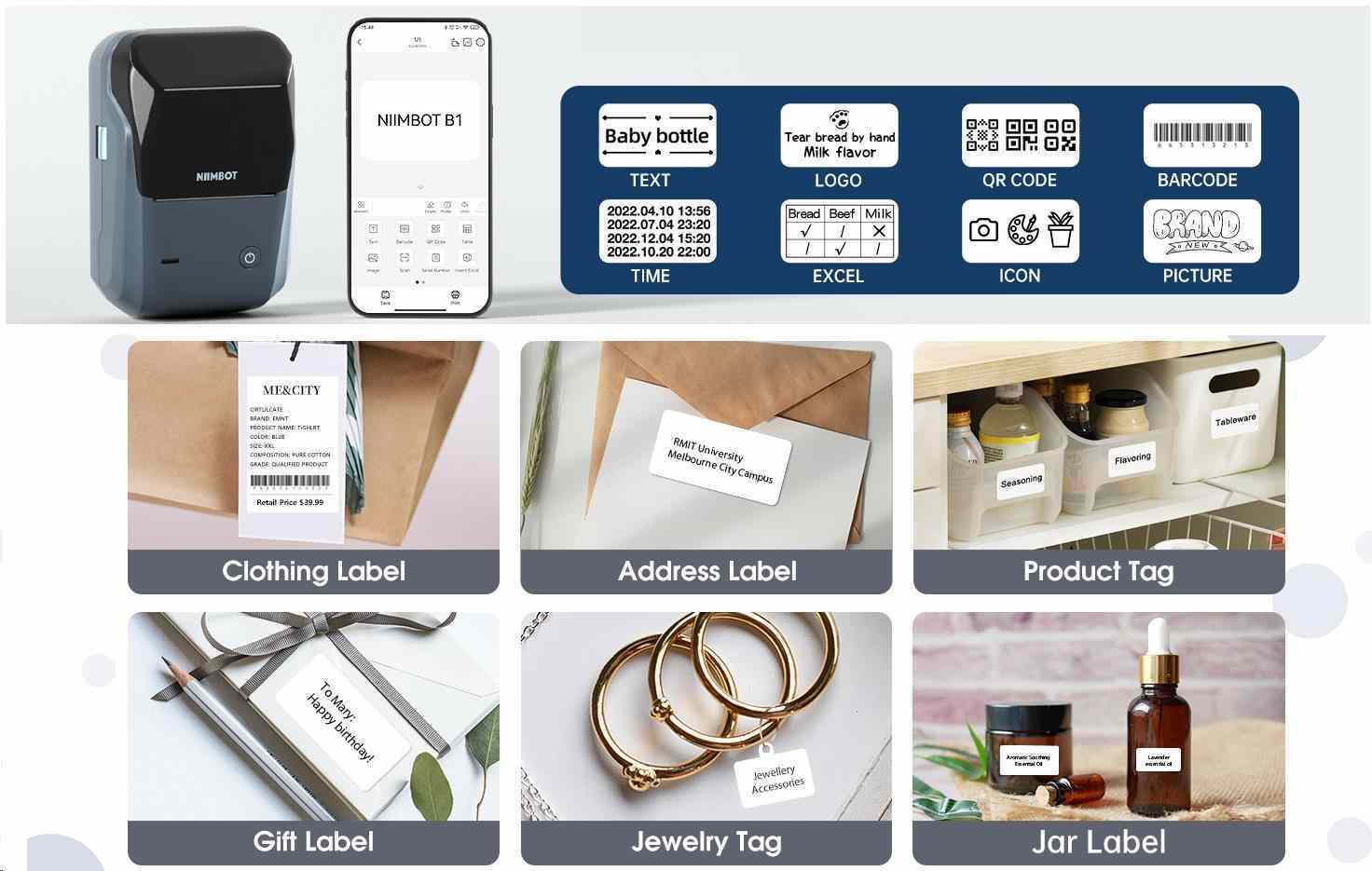 Благодарение на Bluetooth връзка и съвместимост с приложението Niimbot App за Android и iOS е възможно удобно отпечатване на етикети директно от мобилен телефон или таблет. Етикетен принтер Niimbot Smart B1 позволява печат в различни ширини и формати, което го прави универсално решение за етикетиране на стоки, пакети, рафтове, документи или продуктови опаковки.