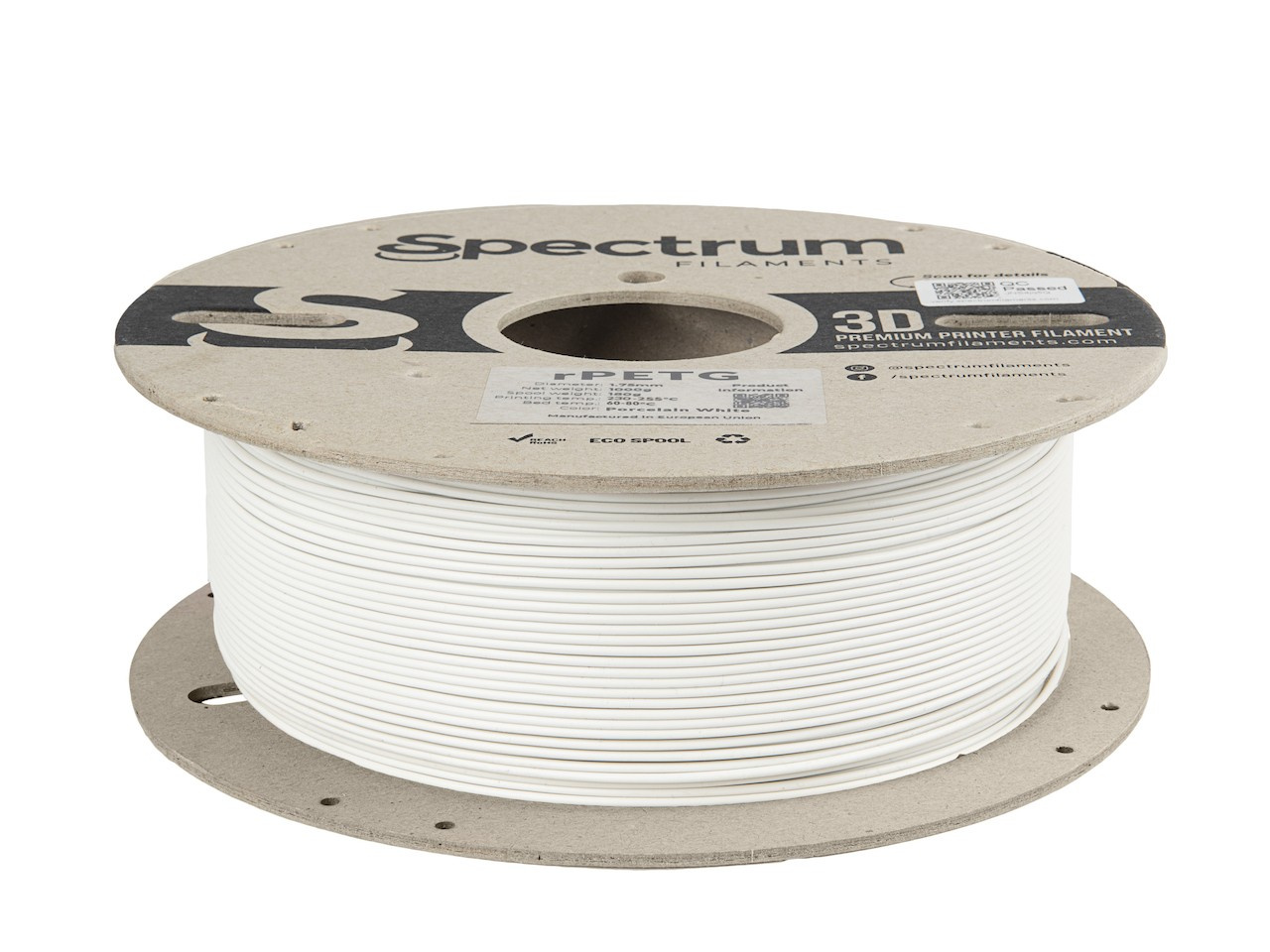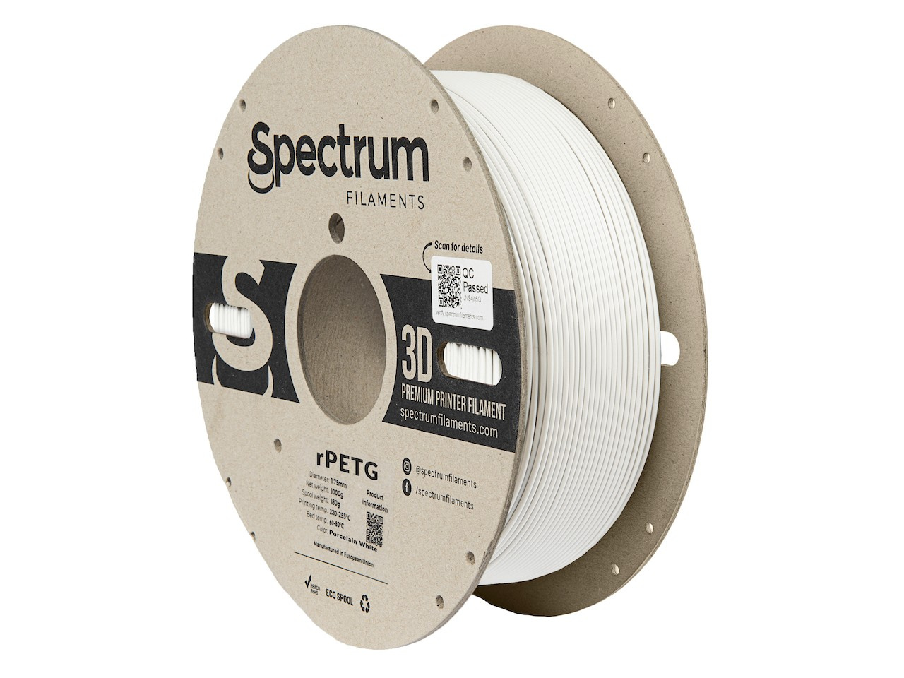 Spectrum rPETG е екологичен материал за 3D печат, който е част от инициативата за устойчивост. Влакното се създава чрез повторно използване на рециклирани остатъчни отпадъци от екструдиране. Суровината се събира, смачква, отново смесва и хомогенизира в високоефективен и лесно печатаем рециклиран PETG филамент със значително по-ниско въздействие върху околната среда. Spectrum rPETG запазва свойствата на класическия PETG, т.е. простота и ефективност на печатане, при много ниско свиване и относително висока якост на опън. За да бъде 3D печатът по-устойчив, Spectrum rPETG е навит на екологична картонена макара.