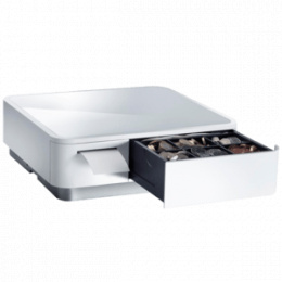 Cash drawer-receipt printer combination, front opening, dimensions (WxHxD): 308x100x300mm, insert: 4 bill, 6/8 coin, 1 check, printer: direct thermal, media width (max): 58mm, roll diameter (max): 50mm, printing speed (max): 100mm/sec, interfaces: 3x USB-A, 1x USB-C (for iOS), 1x USB-B, Bluetooth (5.0), includes: Power cable (EU, UK), USB cable (USB-A/USB-B, white), tablet holder (double-sided), receipt roll, color: blackИзтегляне